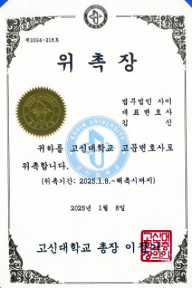 고신대학교(총장 이정기)는 2025년 1월 8일 법무법인 사이(대표변호사 김신)를 고문 변호사로 위촉했습니다. 법무법인 사이는 고신대학교의 운영과 활동 관한 …