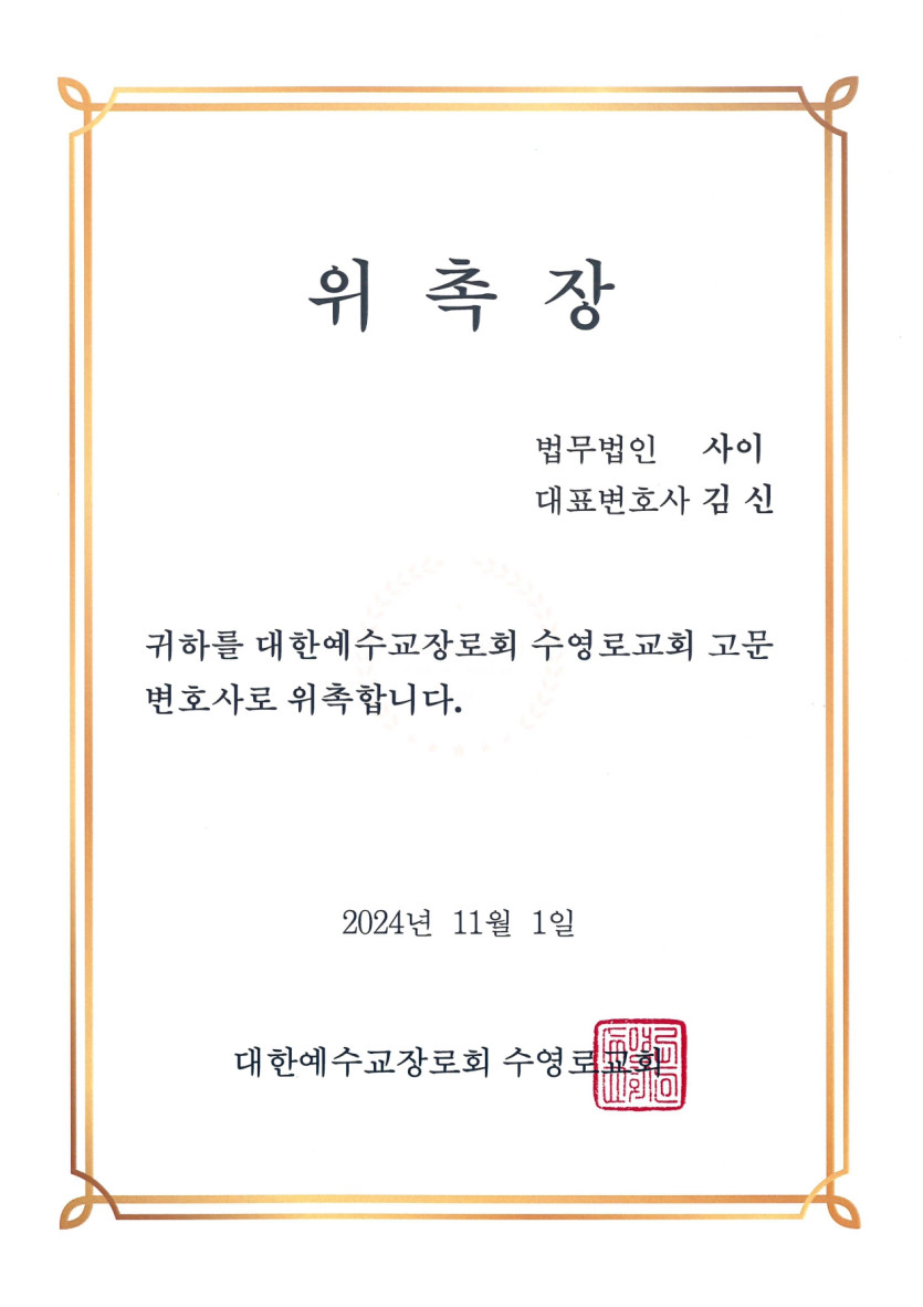 대한예수교장로회 수영로교회[부산광역시 해운대구 해운대해변로 43 (우2동 1418-1)]는 2024년 11월 1일 법무법인 사이(대표변호사 김신)를 고문변호사로 위촉했습니다.