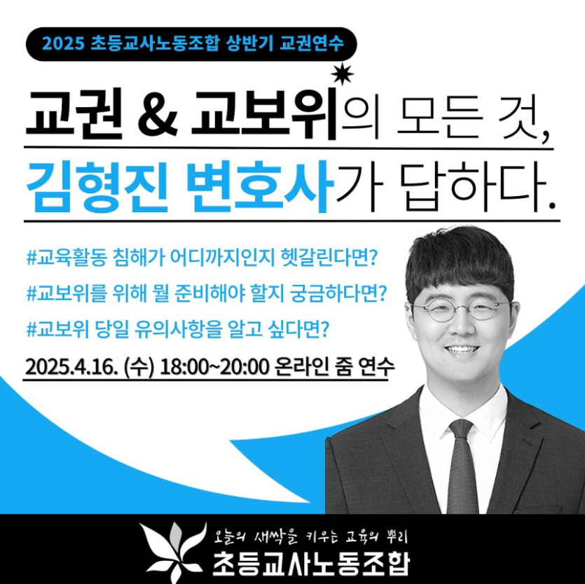 초등교사노동조합 협력변호사인 법무법인 사이 김형진 변호사는 2025년 4월 16일 초등교사노동조합 온라인 교권연수에 강사로 참석하여 교권보호위원회의 절차와 주요 쟁점에 대한 연수를 실시했습니다.